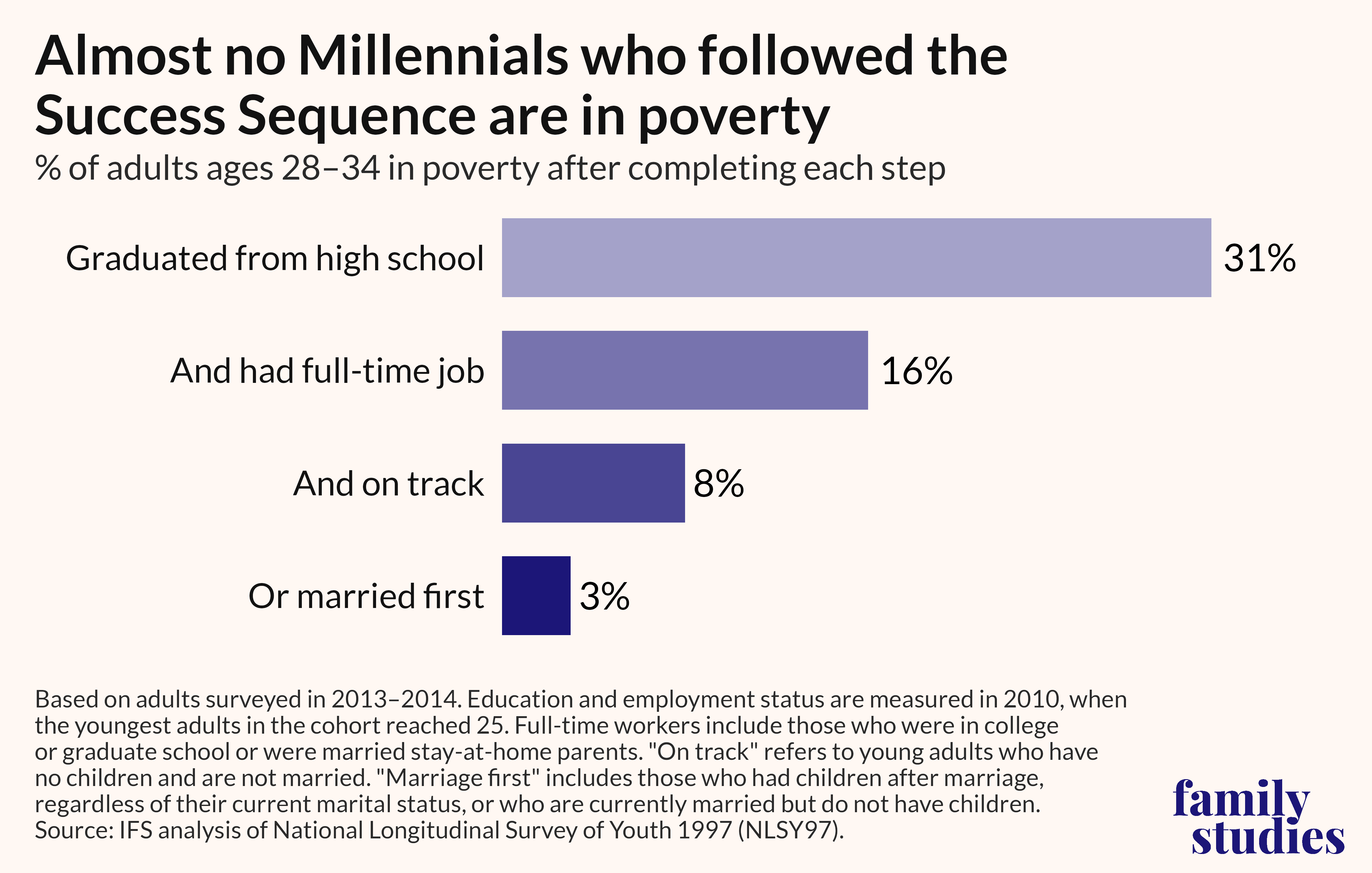 The “success sequence” is set of early life transition markers that, when accomplished in order, are associated with very low risks of experiencing poverty. Specifically, when youth 1) complete at least a high school education, 2) become employed full time, and 3) marry before having children—in that order—then 97% are not in poverty in their mid-30s, and 86% reach at least the middle class.
