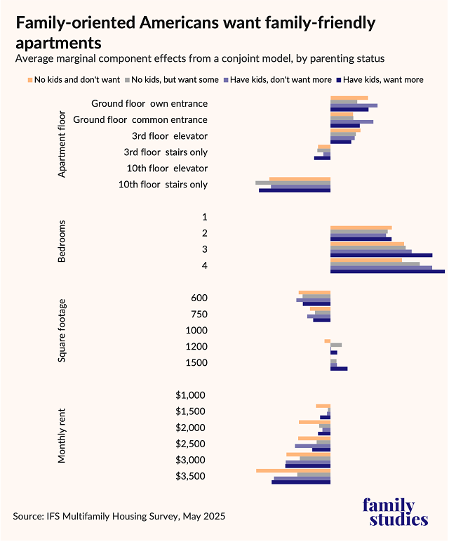 In a conjoint survey design where we asked almost 6,000 U.S. respondents to “trade off” different apartment traits, we found that bedroom count was more influential on their willingness to have another child than almost any other trait, especially for Americans who want more kids.