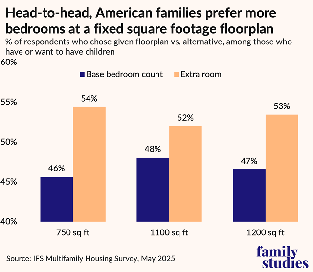 This is a serious problem for young families. Although most Americans want to raise a family in a single-family house, many would be willing to have a first child or even a second in an apartment—if they had extra bedrooms.