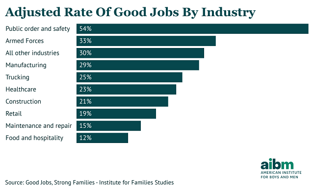 As Martsolf points out, these jobs also tend to score highly in terms of job security, working conditions, and benefits. His earlier IFS paper shows the share of prime-age working-class male workers in good jobs by sector (based on all three characteristics of quality).