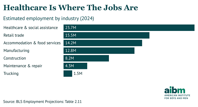 What we can do is help men to take the jobs the 21st-century economy actually creates. Richard Reeves calls them HEAL occupations—health, education, administration and literacy. Many of these occupations are female-coded and have become more so over time, partly because they’re underpaid. But they don’t have to be.