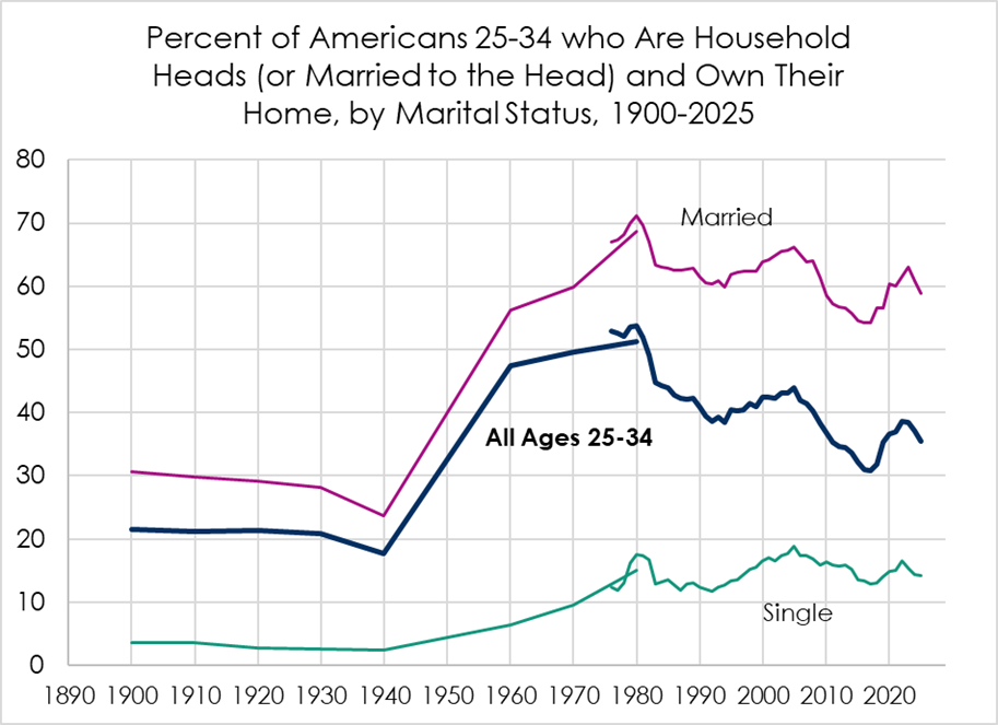 Homeownership trends for young adults look decidedly less dire if we take account of the decline in marriage. A simple way to do that is to separate out single and married Americans ages 25-34. I show these trends in the figure below, going all the way back to 1900 using the decennial census and ASEC data.
