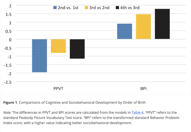 A study published in the American Sociological Review addresses this question with over 30 years of data from the National Longitudinal Survey of Youth (NSLY), which contains information on the long-term cognitive and behavioral effects of adding a sibling for a representative sample of the biological children of U.S. women born between 1957 and 1964. Cognitive outcomes of each child were assessed using the Peabody Picture Vocabulary test that measures an individual’s vocabulary and is a good estimate of verbal ability and scholastic aptitude. Behavioral outcomes of the child were assessed by the mother and included measures of the child’s antisocial behavior, anxiety, depression, hyperactivity, dependency, tendency to be head-strong, and tendency to get into conflict with peers.