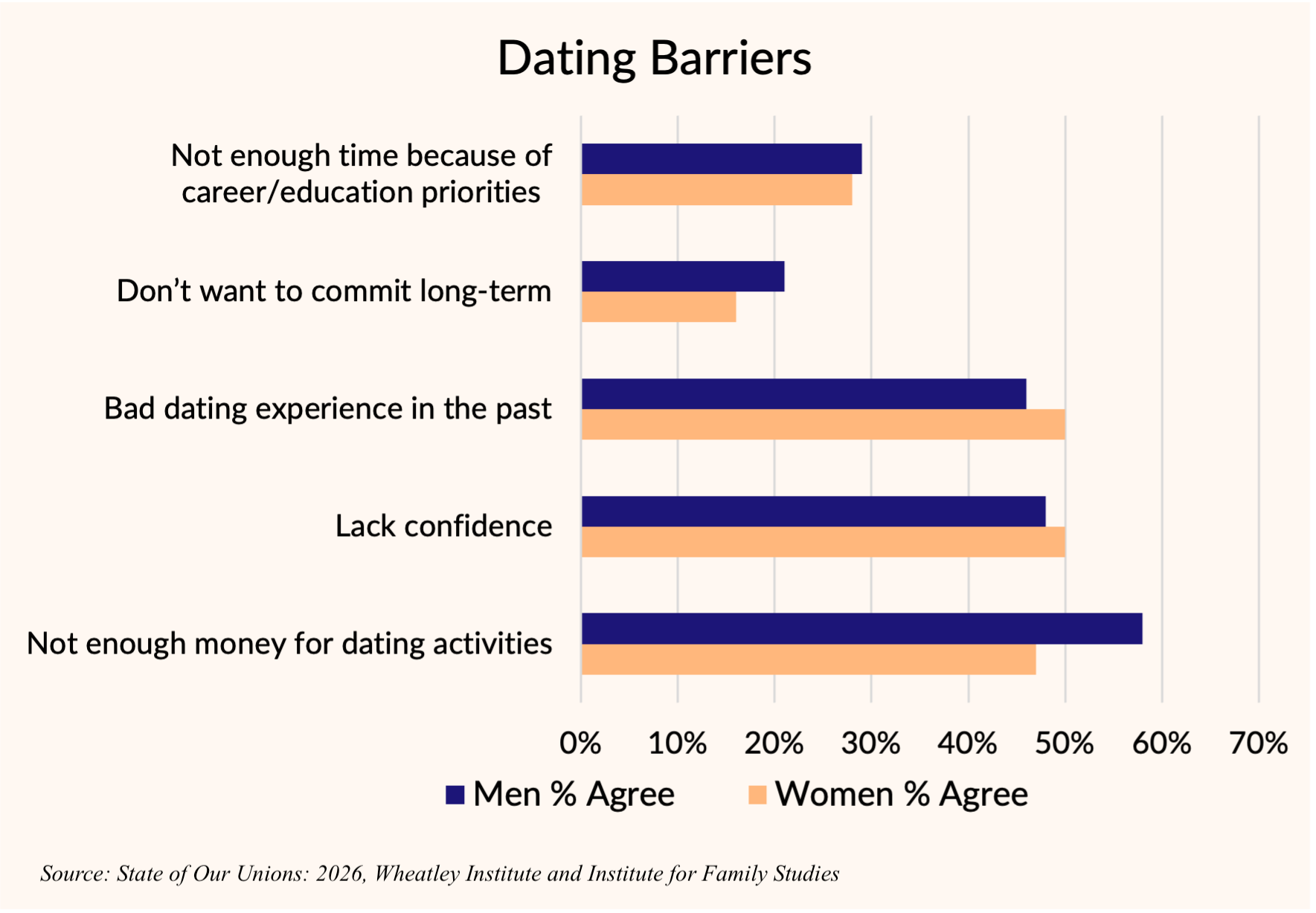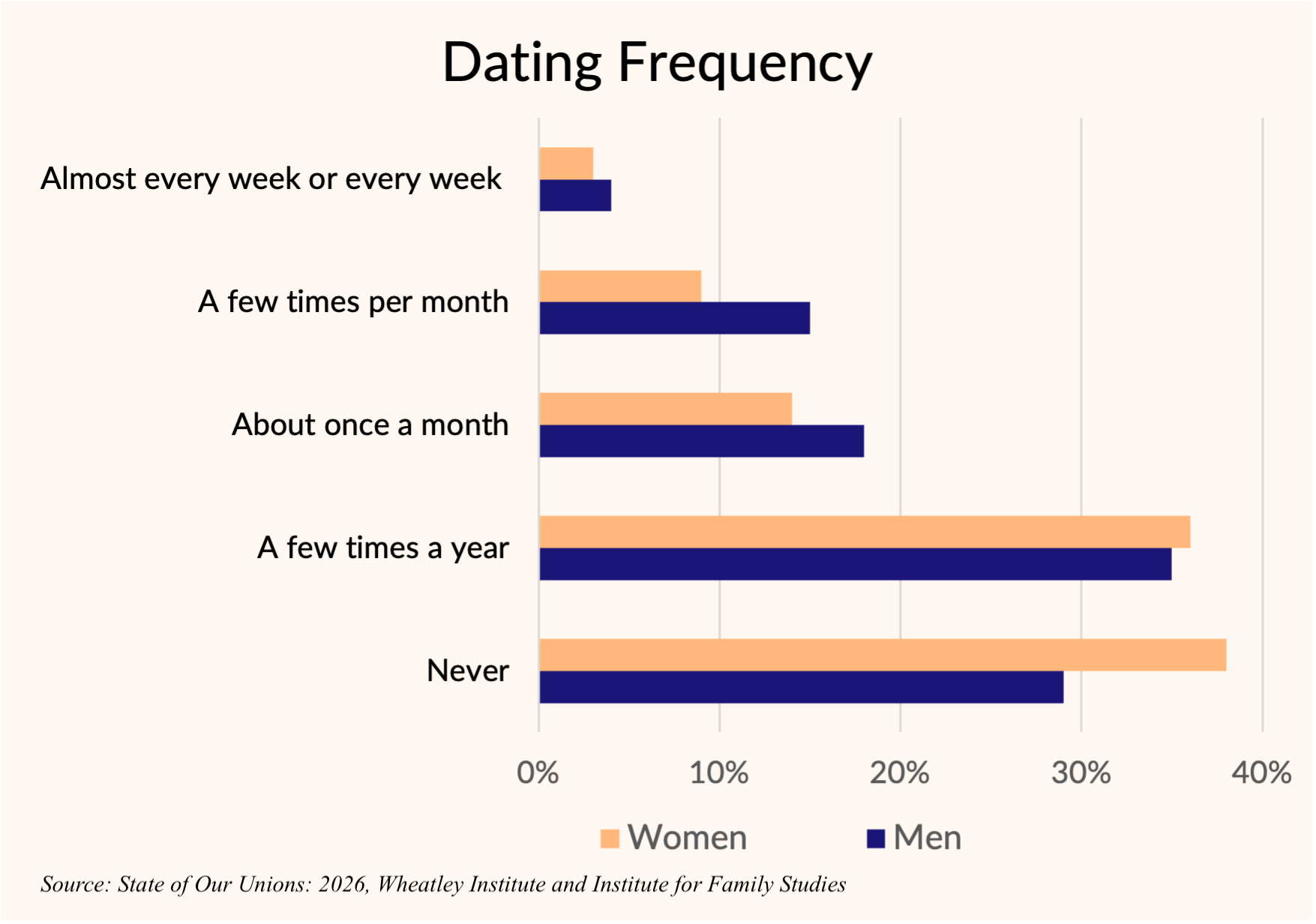 Young adults today are living in a depressed dating economy. That is our conclusion after analyzing findings from the 2025 National Dating Landscape Survey, a nationally representative sample of 5,275 unmarried young adults in their prime dating years (ages 22–35) in the United States. Our analyses focused mostly on the dating experiences of those single young adults who expect to marry someday, or 86% of our sample. Our findings are detailed in the 2026 State of Our Unions report released today by the Institute for Family Studies and The Wheatley Institute. So, what did we learn?
