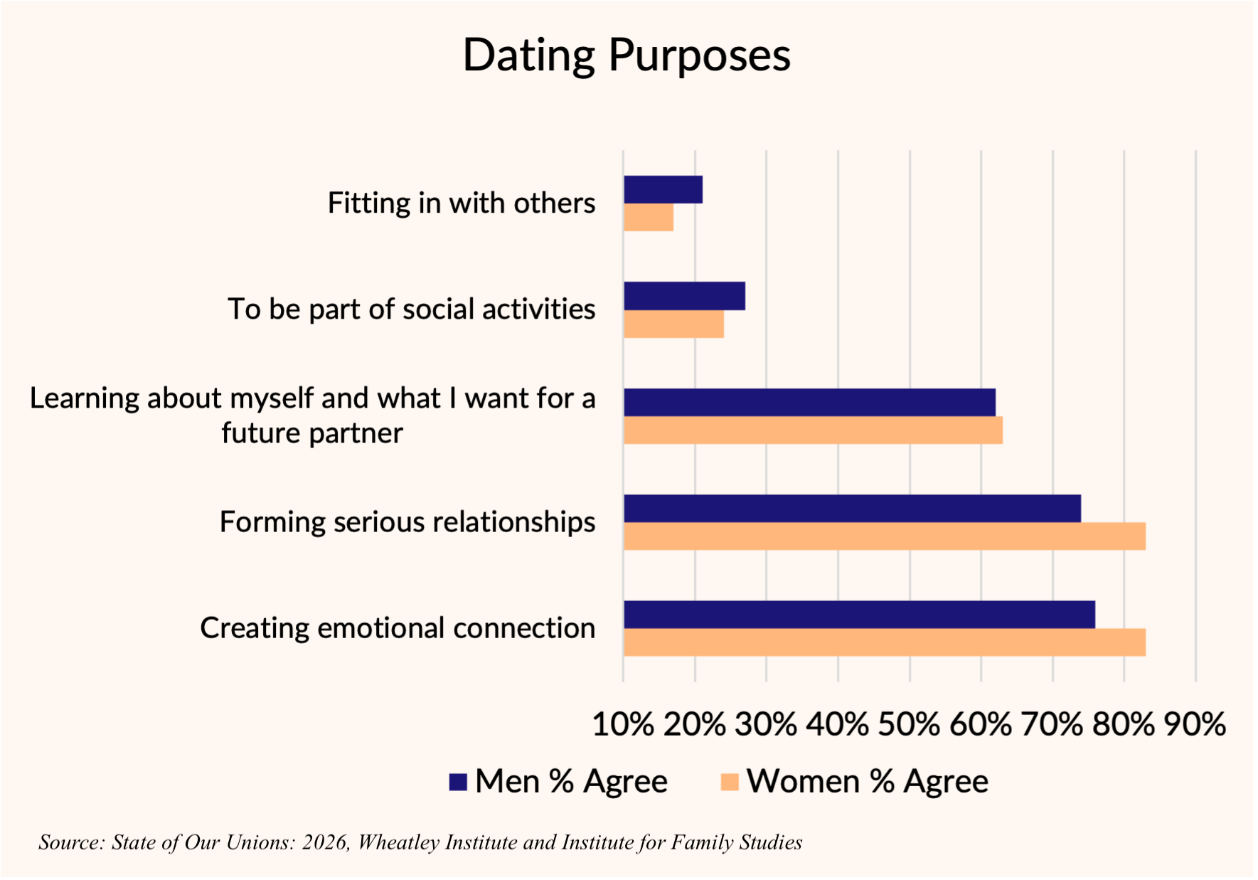 Despite a common narrative that young adults are only interested in casual dating and hooks-ups, we found that young adults—both women and men—strongly endorse a dating culture focused on forming serious relationships, creating emotional connections, and learning what they want for a future partner. While dating frequency may be low, most young adults seem to yearn for the connection of serious dating. The social purposes for dating (being part of social activities, fitting in with others, etc.) were endorsed by less than a quarter of young adults.