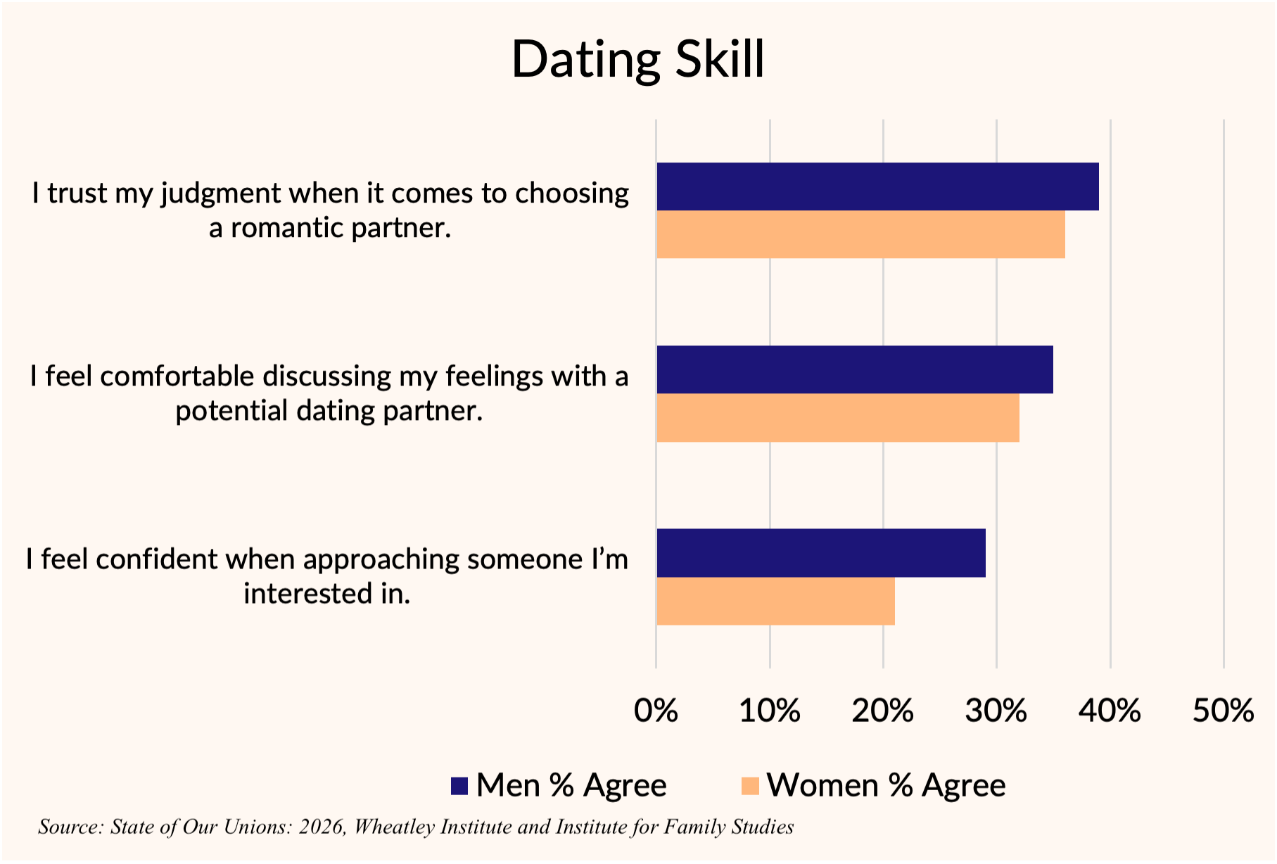 Among the rising generation, dating confidence is low, with only about 1-in-3 young adults expressing much faith in their dating skills. Less than 4-in-10 (37%) said they trusted their judgment when it comes to choosing a dating partner. A similar minority of young adults expressed confidence in their ability to discuss feelings with a dating partner (34%) and picking up on social cues on dates (36%).