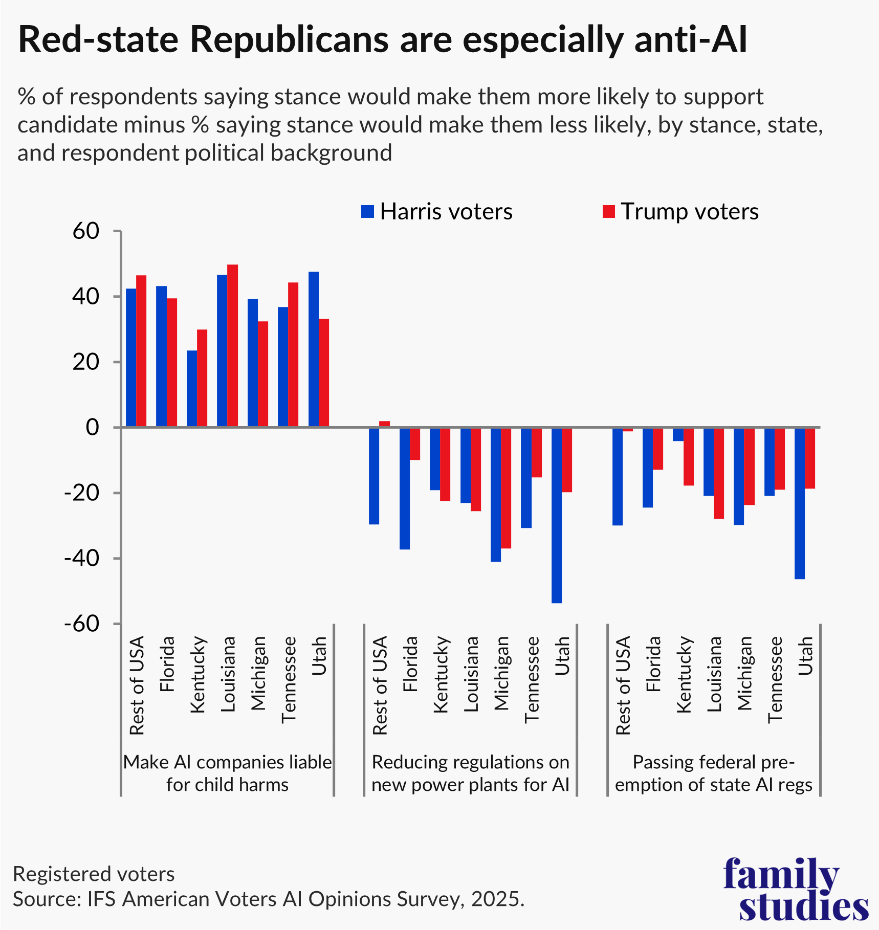 A new Institute for Family Studies survey shows that Trump voters in Red states are more supportive of candidates who will regulate AI companies and impose liabilities on those that cause harm. At the same time, we find that Trump voters in Red states will oppose Republican candidates at the ballot box that push policies to accelerate Artificial Intelligence.