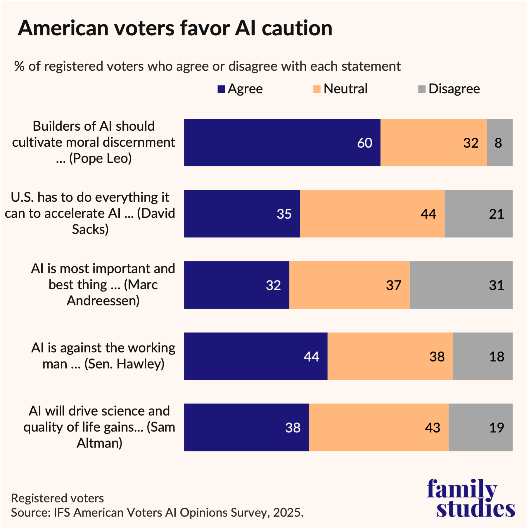 - Comparing strong messaging about AI, voters more strongly agree with statements by Pope Leo XIV and Senator Josh Hawley (R-MO) than with AI investor Marc Andreessen. Post This