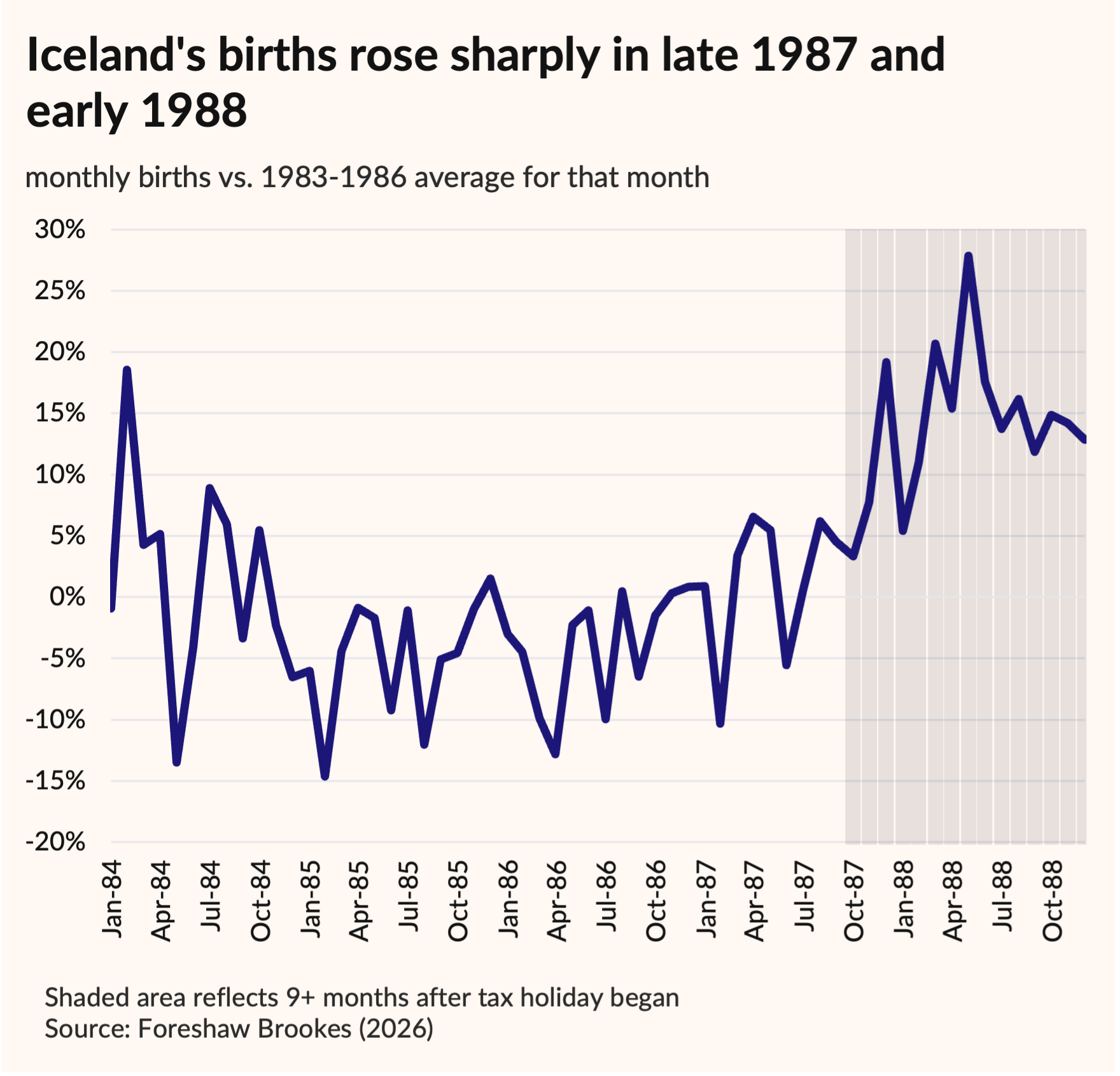 But to further demonstrate the effectiveness of this policy in a new working paper, I isolated the effect of the tax holiday on fertility rates by analyzing month-by-month fertility data. As mentioned, the tax-free year was announced in December 1986 and came into effect in January 1987. Therefore, if the lack of taxes—and resulting increase in real disposable income—raised conceptions, one would expect it to affect fertility specifically in the later months of 1987. Using a method called interrupted time series analysis that identifies structural breaks in data series, I found that Iceland births broke from their prior trend in November and December 1987. Since most couples don’t successfully conceive on their first attempt, it’s to be expected that major fertility effects wouldn’t be observed exactly 9 months after the policy announcement.