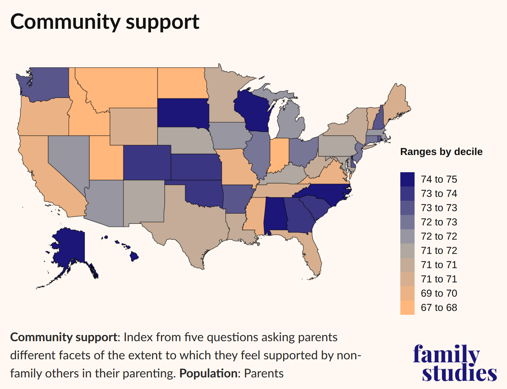 The customary output of IFS surveys and analyses are statistics and graphs of varying complexity. Because this report is concerned with parenting culture and with gauging differences between places, the findings below will be presented, with a few key exceptions, in the forms of scores and maps, though future publications will explore these results in more detail.