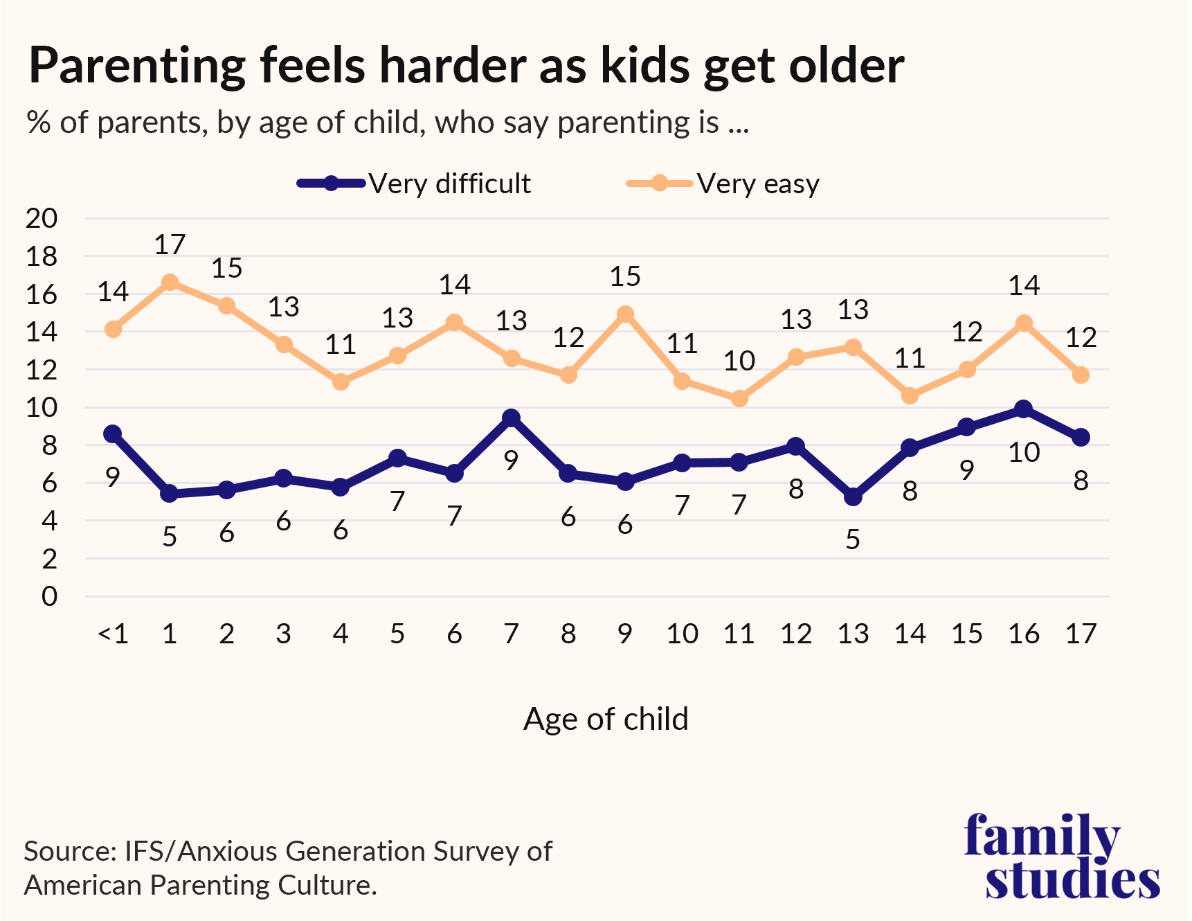 Here, we show an overall view of how parents nationwide feel about parenting by children’s ages. American parents perceive the difficulty of raising children to peak in infancy, then they feel the difficulty decline, before it rises again as children grow older. Contrary to some popular narratives that parenting toddlers is the most difficult, parents tend to describe those early years as being “as easy as it gets.” But where do parents feel that parenting is easiest and where do they feel it is hardest?
