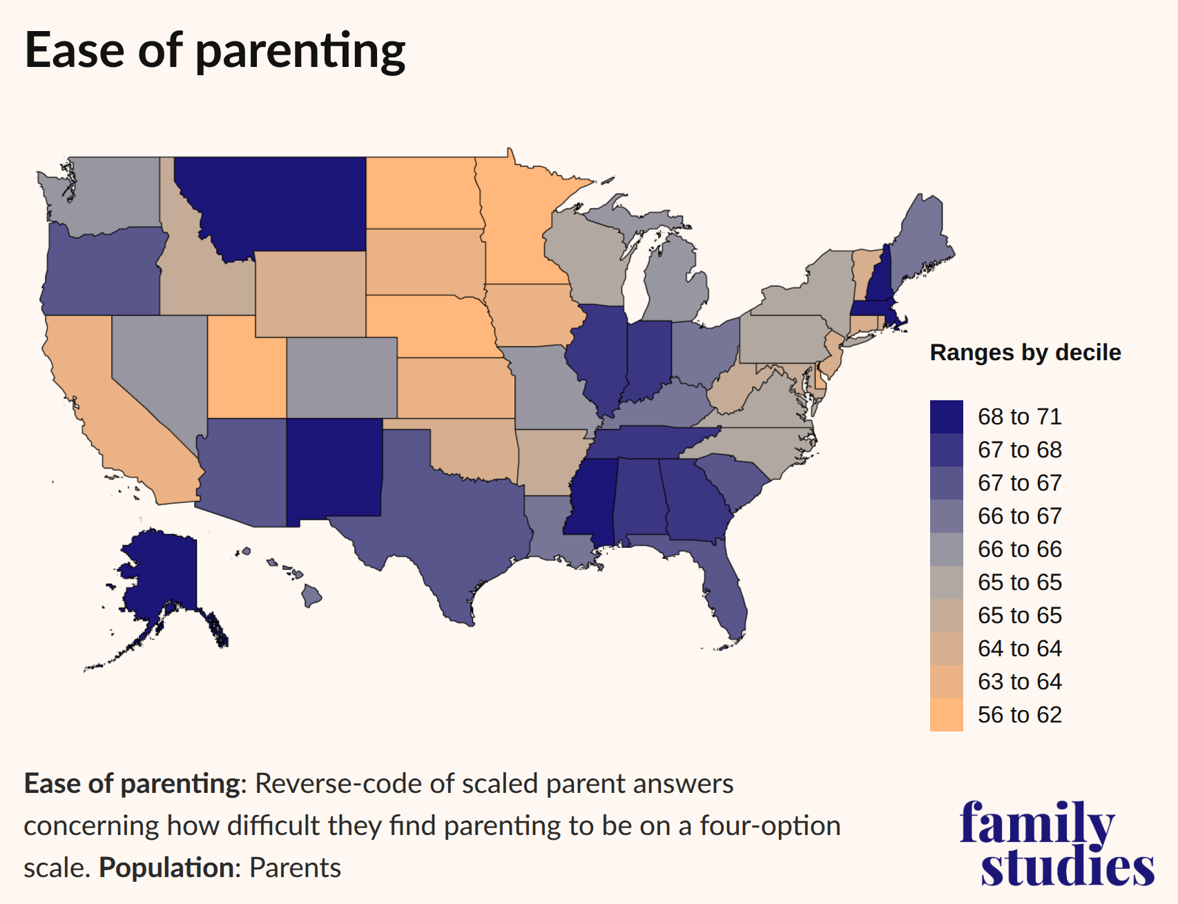 Parents feel that the work of raising children is easiest in Upper New England, the Deep South, the Midwest, and the Southwest. Parenting feels hardest along the Eastern Seaboard and in the Great Plains, while the Mountain states provide a mixed experience.