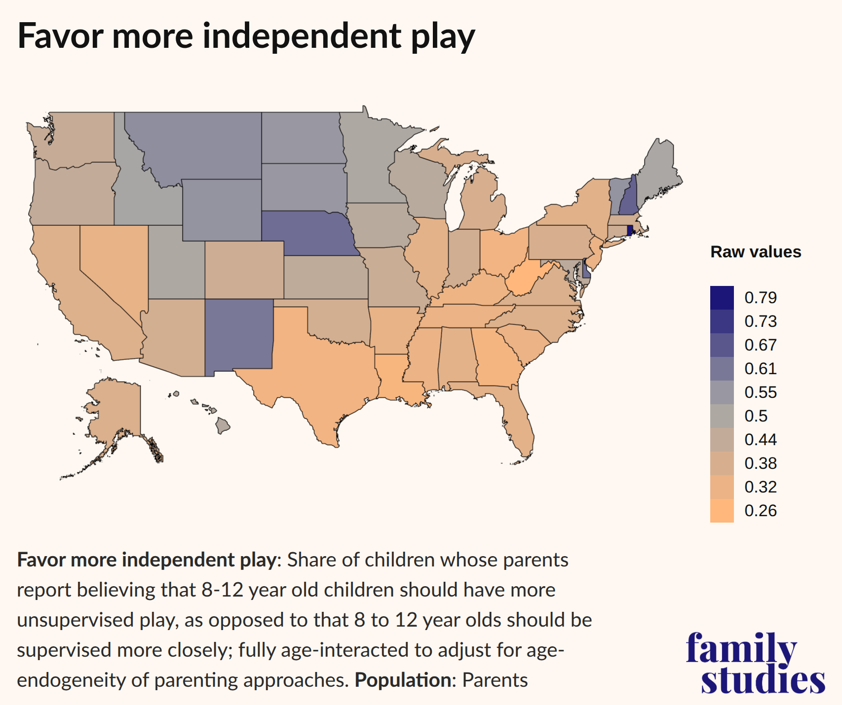 Finally, we tested whether there are regional or state-level differences in how parents feel about the amount of unsupervised play for children ages 8 to 12. Do parents feel that children should have more time with unsupervised play, or do they believe they need more parental supervision? This question is designed to measure the extent to which parents across the country support higher or lower levels of autonomy for children.