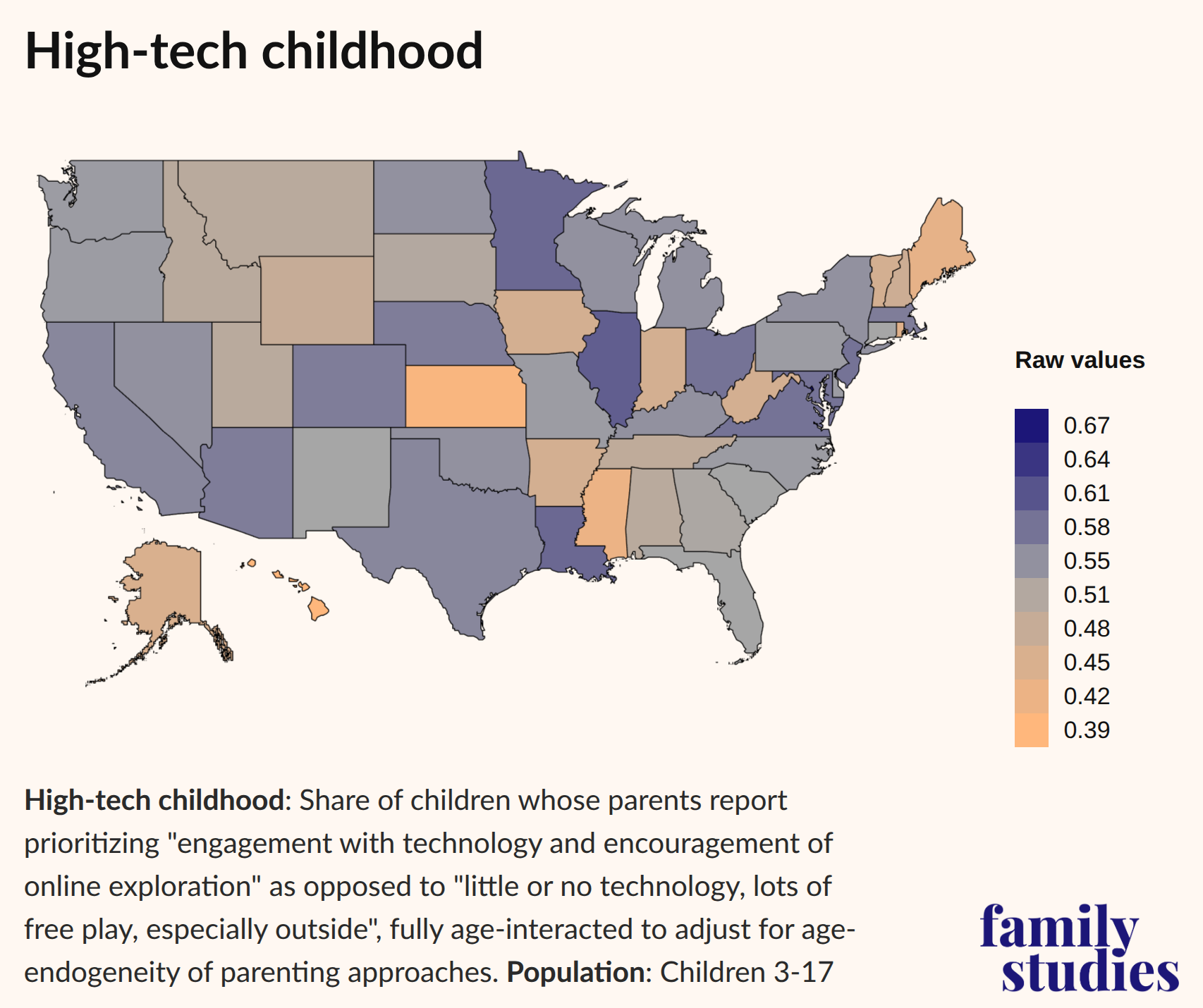 But can we identify localities where high-tech childhoods (places where children are encouraged to engage with technology and explore online) and low-tech childhoods (places with "little or no technology, lots of free play, especially outside”) are concentrated? This analysis yields weaker regional trends, and we find much more variation by state. The Mountain states, the South, and New England (as well as Alaska and Hawaii) still show up as places where families are trying to foster “low-tech childhoods.” However, the states with the most pro-technology parents are not very regionally clustered—e.g., Minnesota, Illinois, Louisiana, Ohio, New Jersey, and Virginia—except for the whole Southwest, where parents appear to broadly exude a relatively pro-tech approach to raising children.