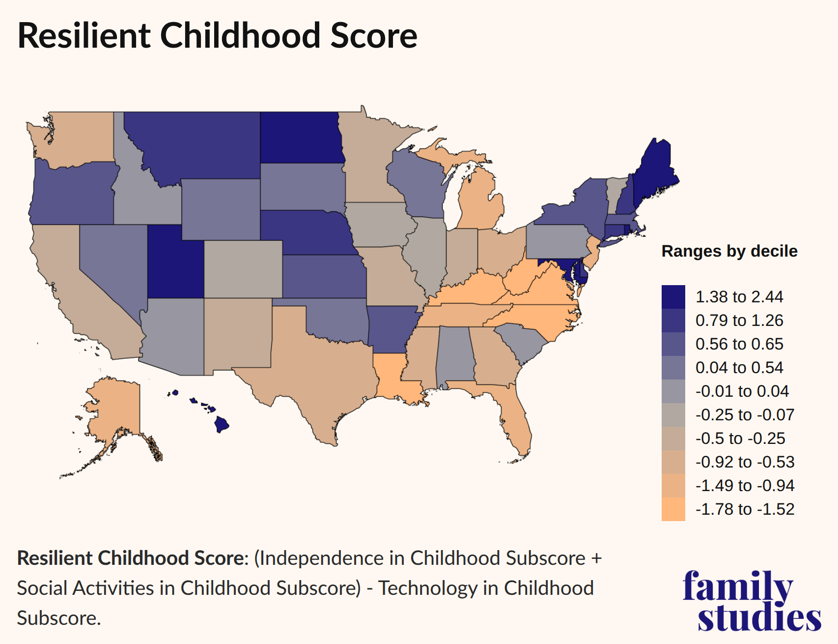 To get a picture of the overall experience of childhood in America, we created the “Resilient Childhood Score” (RCS). In the RCS, states score higher if their children have more independent activity and more outdoor play, report a broader range of life experiences, have more social time with friends, and receive less adult supervision. States score lower if kids have more devices, more social media accounts, spend more time online, or if the family (for a variety of reasons) does not limit screen time.