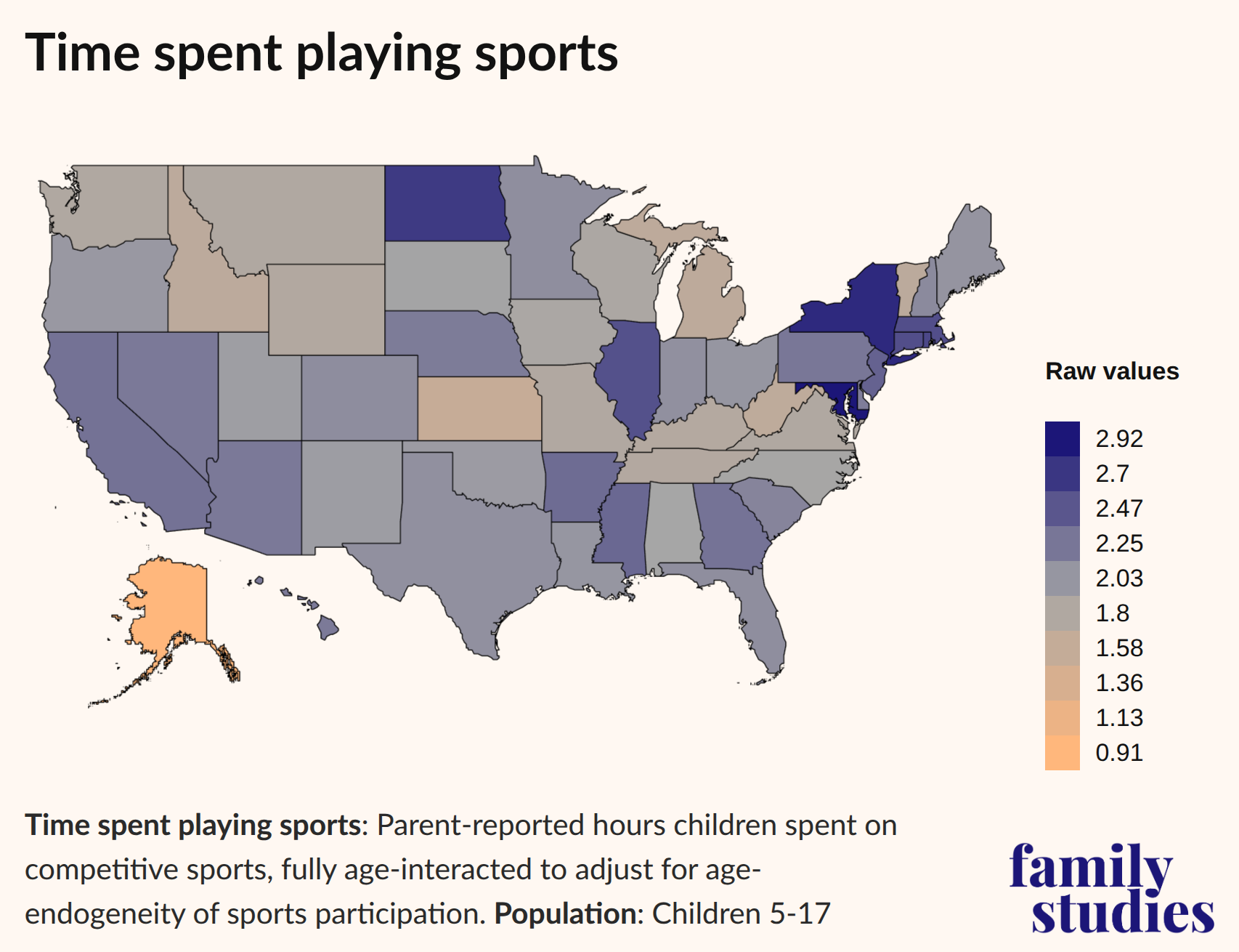 We find lower outdoor playtime in many of the more northern states, especially Alaska, Michigan, or South Dakota, and more outdoor playtime in many of the more southern states, like Arizona, South Carolina, Missouri, or Alabama, as well as Maryland.
