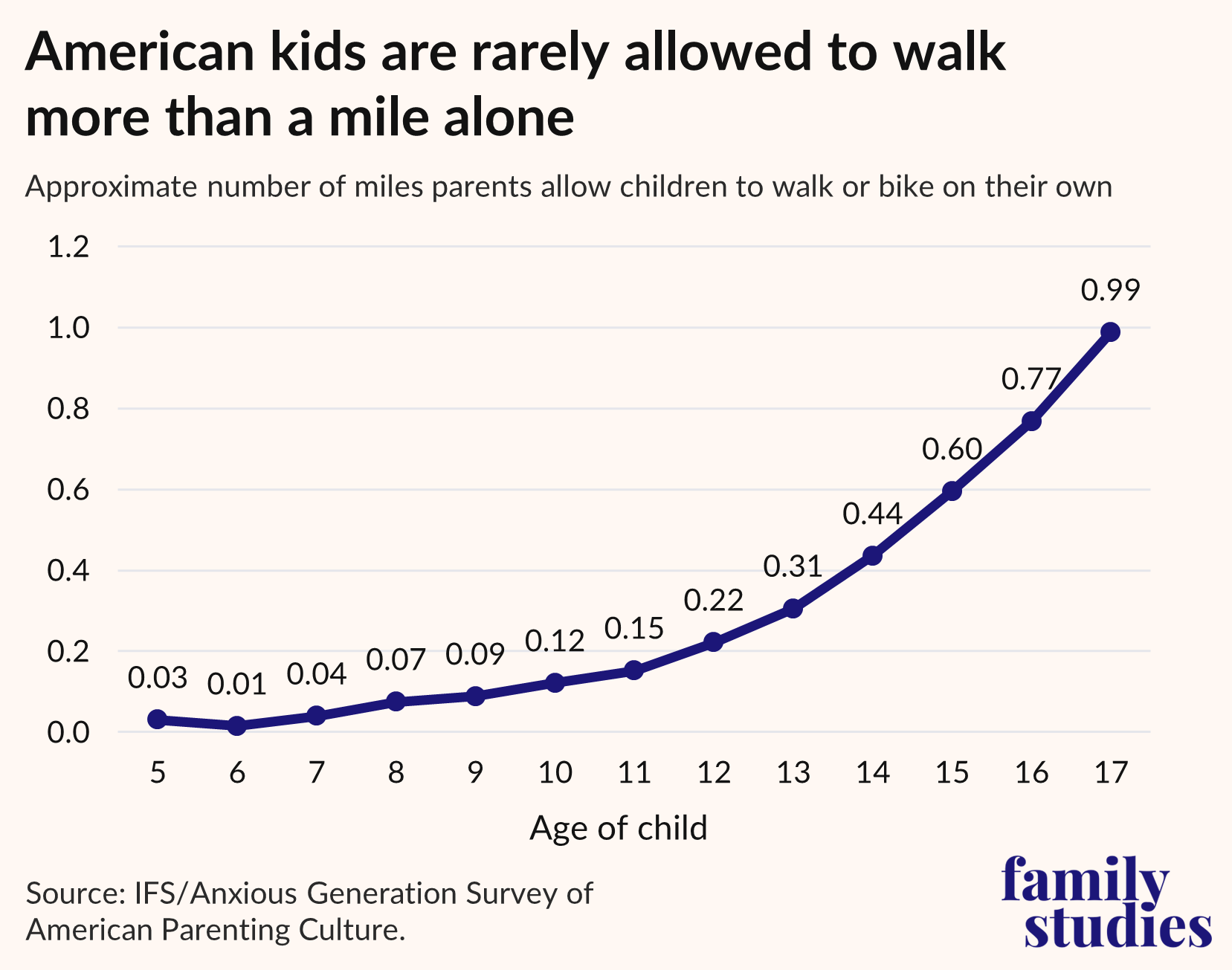 When looking at our national sample as a whole, we show in the figure below the typical number of miles from home that American children at each age are permitted to walk or bike without an adult accompanying them: