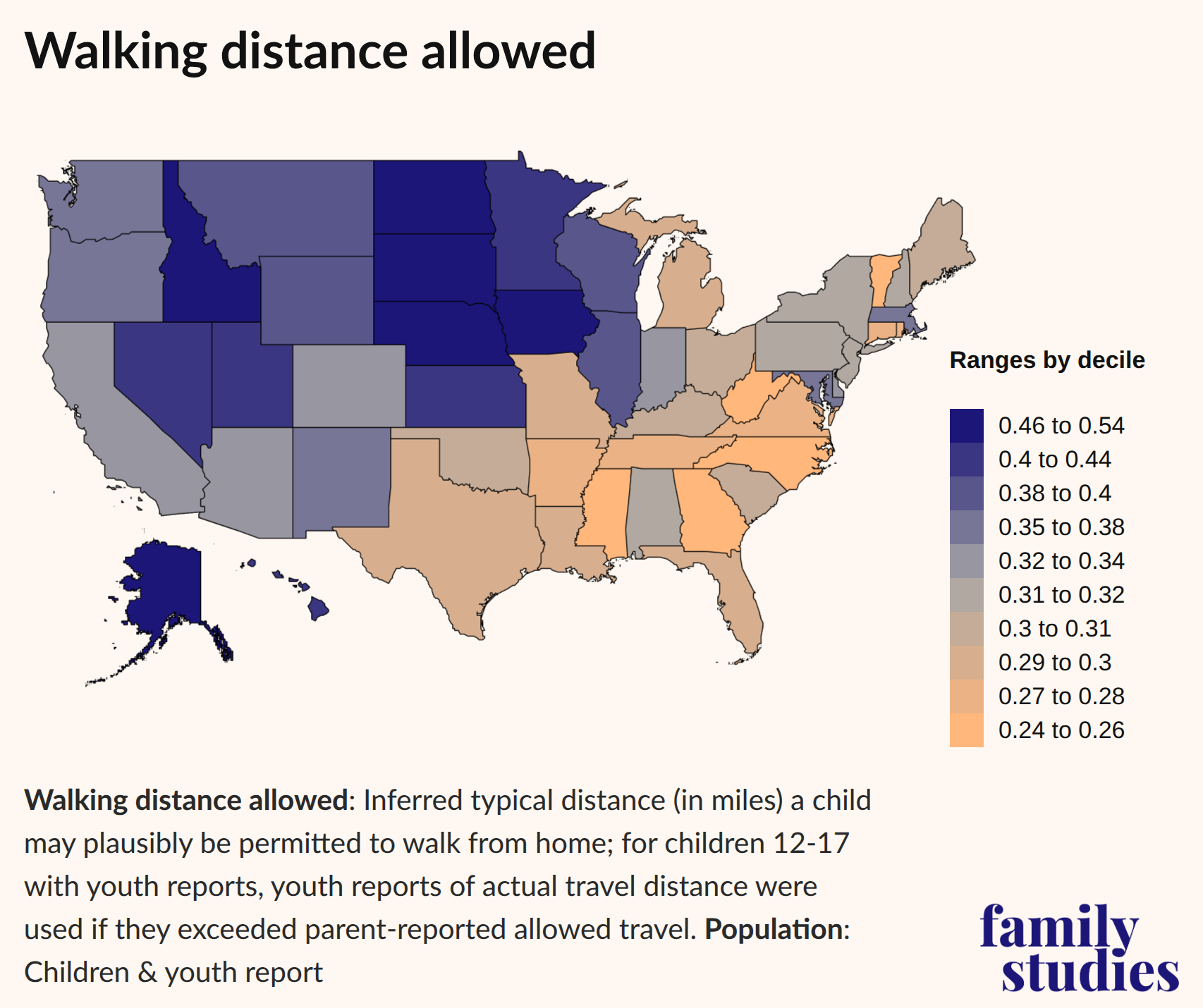 Next, we wanted to visualize how far parents across the country allow their children to travel unsupervised. These approximate distances are converted from answers supplied by parents themselves in which they estimate the permissible range of their child’s mobility. But since these values are approximate, our map below shows broad state ranks. Because, again, the distances children are allowed to walk are highly variable by age, we fully control for age.