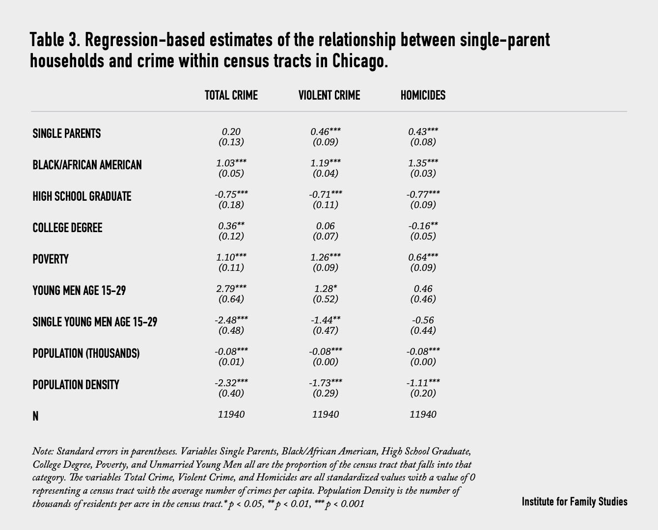 We find that cities are safer when two-parent families are dominant and more crime-ridden when family instability is common. The same story applies to the neighborhoods of Chicago. More specifically, we find the total crime rate is about 48% higher in cities that have above the median share of single-parent families, compared to cities that have fewer single-parent families. That difference is even larger with respect to violent crime and homicide, specifically, with cities above the median level of single parenthood experiencing 118% higher rates of violent crime and 255% higher rates of homicide. In the Windy City, relying on an analysis of census tract level data, our research indicates that neighborhoods above the median fraction of single-parent-headed households experienced 137% higher total crime rates, 226% higher violent crime rates, and 436% higher homicide rates.