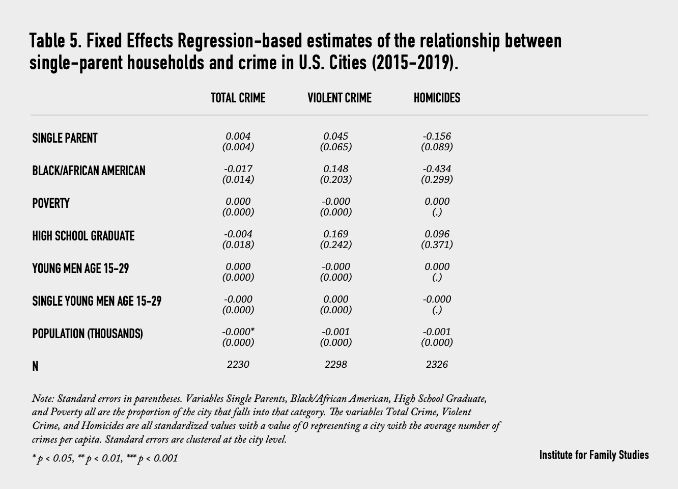 But, in keeping with previous research, our analysis also finds that single parenthood is not always, nor the only, predictor of crime rates. Factors like poverty and race also are linked to violent crime rates in cities across the nation and in ways consistent with the “structural perspective” on crime. Likewise, recent increases in crime, which have occurred without marked changes in family life, suggest that changes in law-enforcement and the prosecution of criminals have also had a hand in the recent uptick in violent crime in American cities. These changes are consistent with classic theories that stress the value of smart policing and prosecution when it comes to reducing crime. So, family appears to be one—but not the only—factor associated with violent crime. Efforts to reduce crime will have to strengthen neighborhood institutions, improve schools, and bolster the effectiveness of local law enforcement.