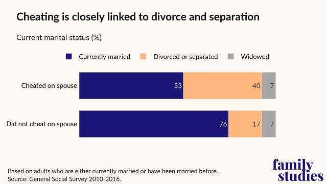 Among ever-married adults who have cheated on their spouses before, 40% are currently divorced or separated. By comparison, only 17% of adults who were faithful to their spouse are no longer married. On the flip side, only about half of “cheaters” are currently married, compared with 76% of those who did not cheat.